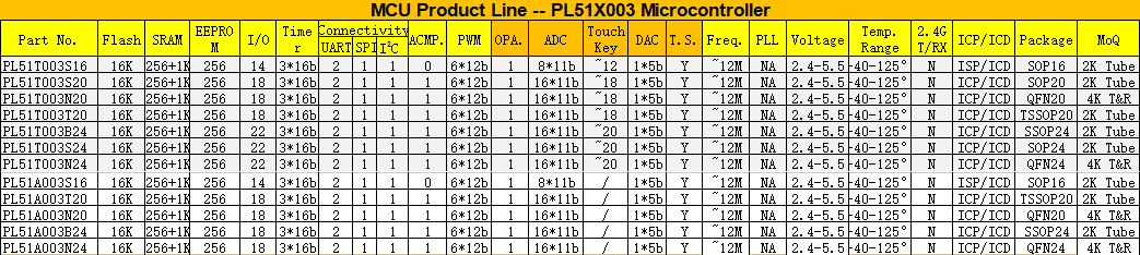 Recently, our company launched pl51 Series 003 product line with ADC function, integrated real EEPROM microcontroller and built-in high-performance single cycle et8051 core. This series of chips has up to 18 bidirectional general-purpose I / OS, It supports 15 interrupt sources (including 2 external interrupts) and has 4 interrupt priorities. In order to improve reliability and reduce cost, the chip has built-in reliable watchdog timer (WDT), low voltage detection (LPD) and low voltage reset (LVR) function module. Excellent anti-interference and ESD protection ensure that the single chip microcomputer can operate reliably in the harsh electromagnetic interference environment. At the same time, it provides rich communication interfaces, which can be widely used in small household appliances, touch keys, robots, touch audio, touch razors, electric toothbrushes, led effect lights, battery charging management, wireless charging, automotive instruments, etc There are two areas.